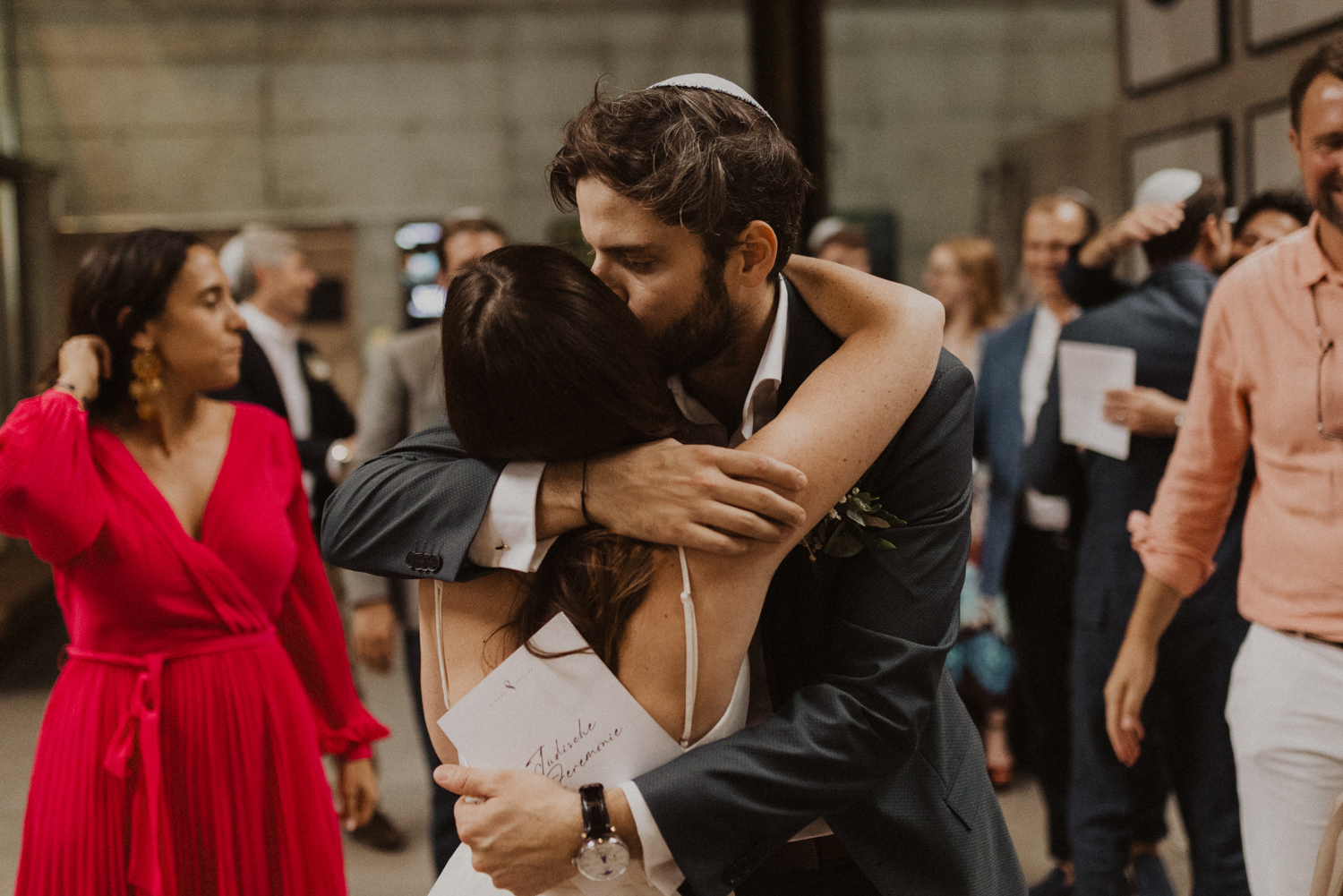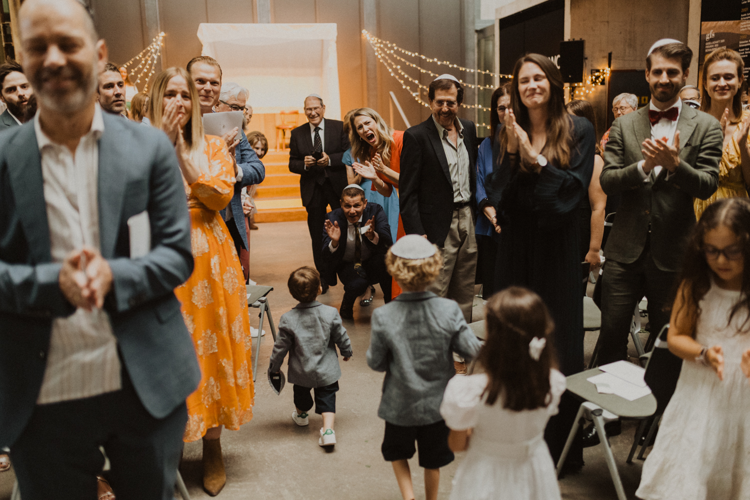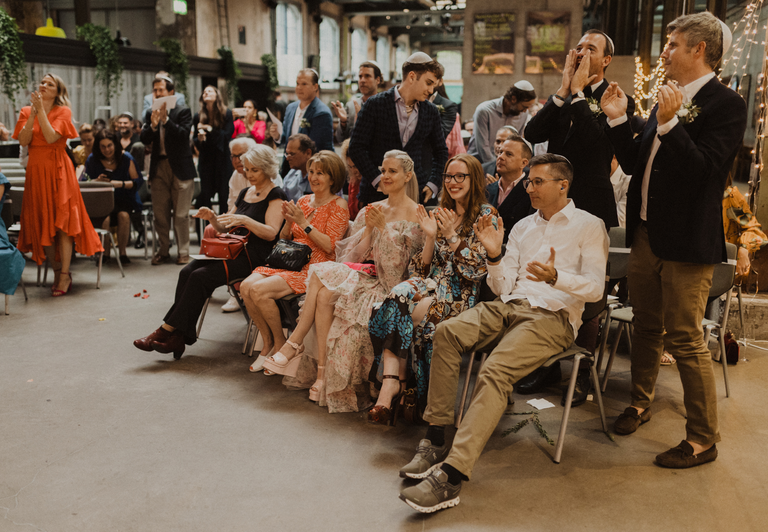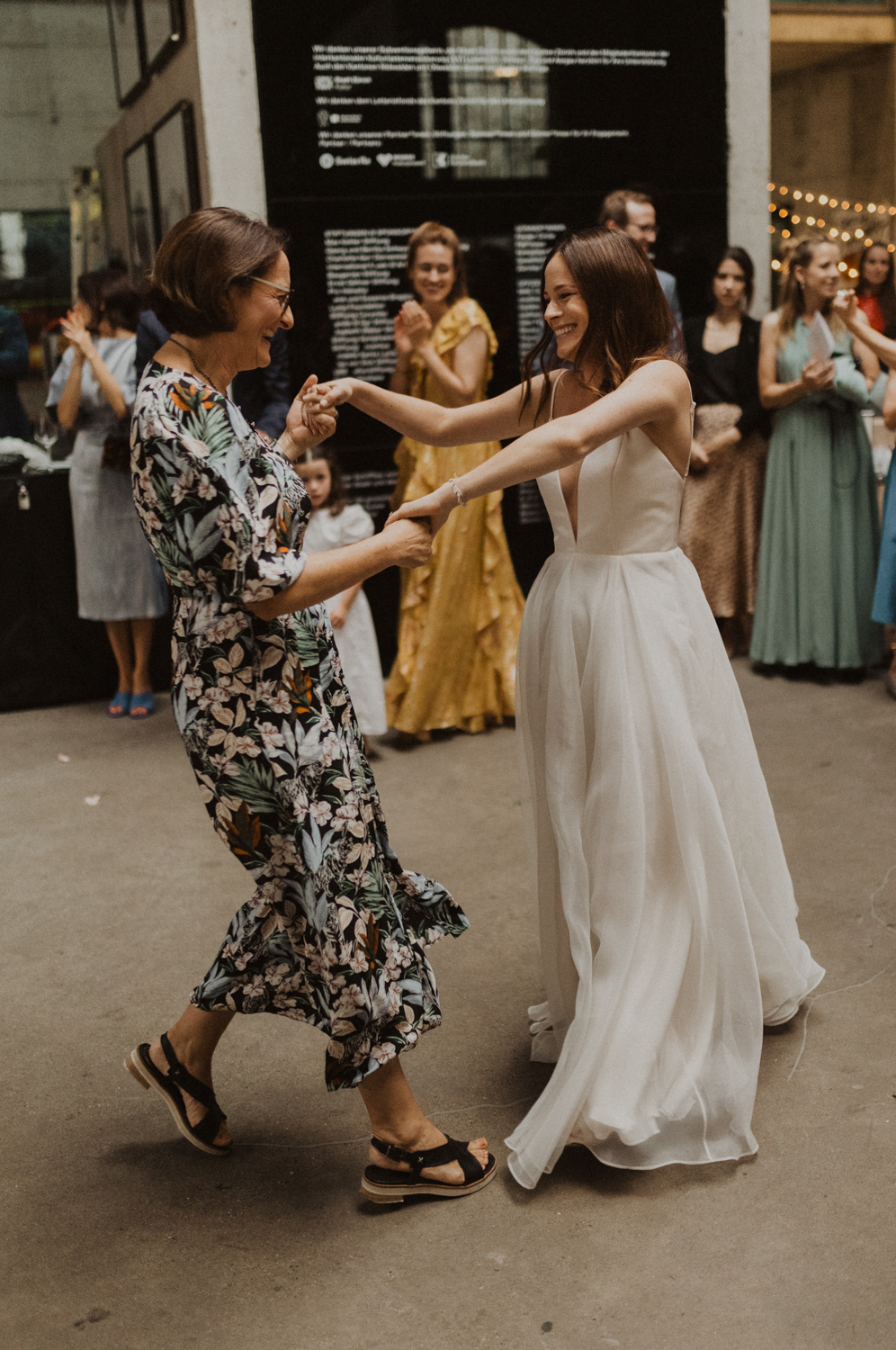 Die Gäste wurden vor der Zeremonie herzlich willkommen geheissen zu einem kleinen Apero. Danach nahmen alle Platz im super stylischen Innenraum des Schiffbau. Es wurde von einem begabten Künstler jüdische Lieder auf hebräisch gesungen, und alle welche die Lieder kannten, klatschen fröhlich mit. Ich war ehrlich gesagt super überrascht wie schön diese Sprache klingt! Der Bräutigam stand vorne bereit um seine Braut in Empfang zu nehmen. Simone hatte bei ihrem Einzug und auch noch anschliessend den Schleier traditionell noch vor dem Gesicht. Die beiden sassen auch, wie das so üblich ist bei jüdischen Trauungen, unter einer Chuppa. Nach dem Eheversprechen, der Ringübergabe, dem obligatorischen Kuss und den Segnungen durfte Philipp noch ein Glas zertreten. Auch das ist Tradition und war neu für mich. Anschliessend wurde so richtig zu jüdischer Musik getanzt und gefeiert. Es war eine super fröhliche Stimmung und hat mich sehr berührt! Danach gab es ein leckeres Apero und es wurde rege geplaudert und gratuliert. Nach diesem Zusammensein ging es in den wunderschönen Festsaal im Schiffbau. Ins Restaurant LaSalle. Die Dekoration war wirklich einmalig schön, das Essen super lecker und die Bedienung sehr freundlich. Es fanden Beiträge statt, einige Reden und Erinnerungs-Powerpoints gab es natürlich auch. Es wurde gelacht und die Liebe von Simone & Philipp gefeiert. Anschliessend kam eine richtig coole Live-Band «Maxin», welche die heutigen Hits Live spielt. Die Stimmung war super und Simone & Philipp liessen es sich nicht nehmen, zu ihrem Lieblingssong mitzusingen.