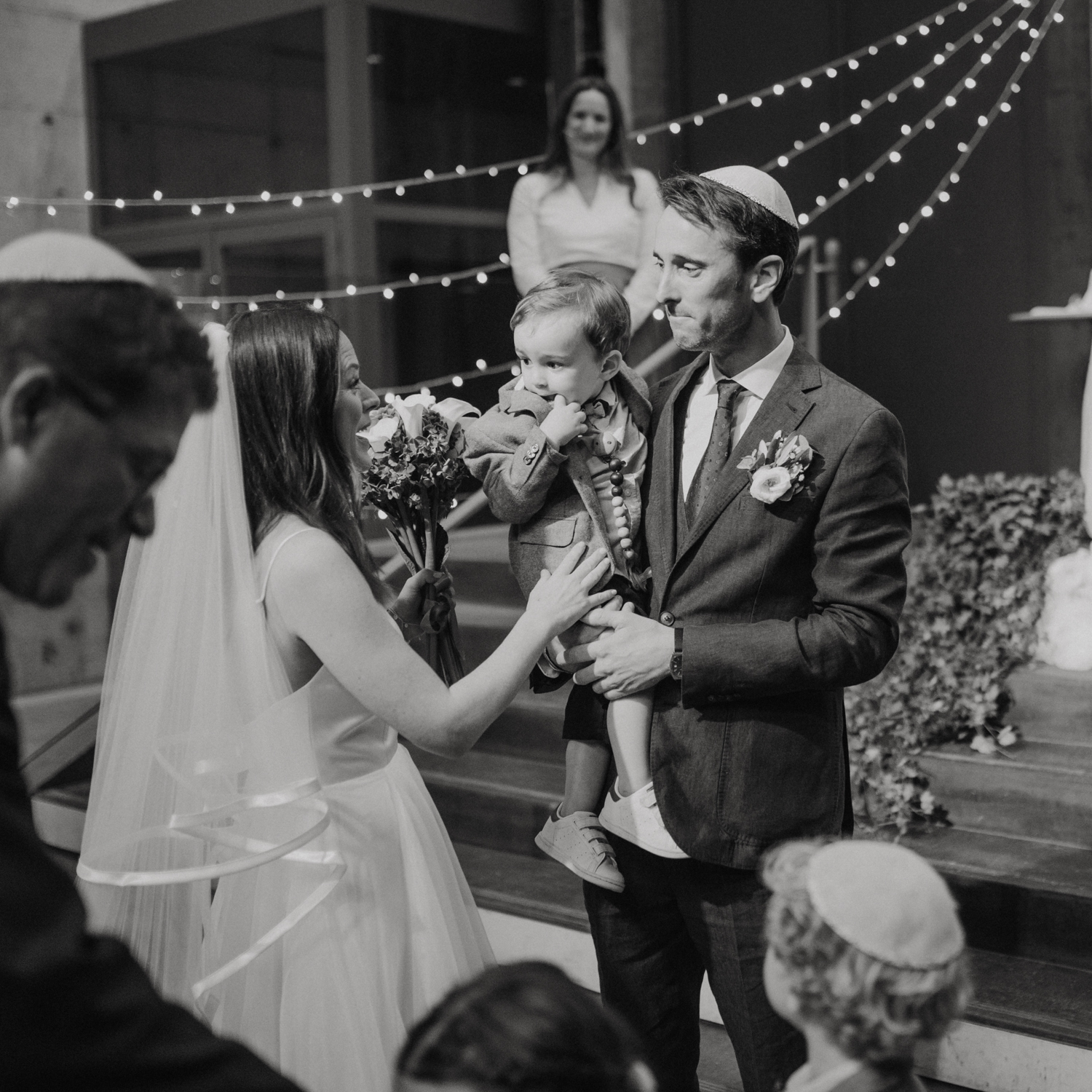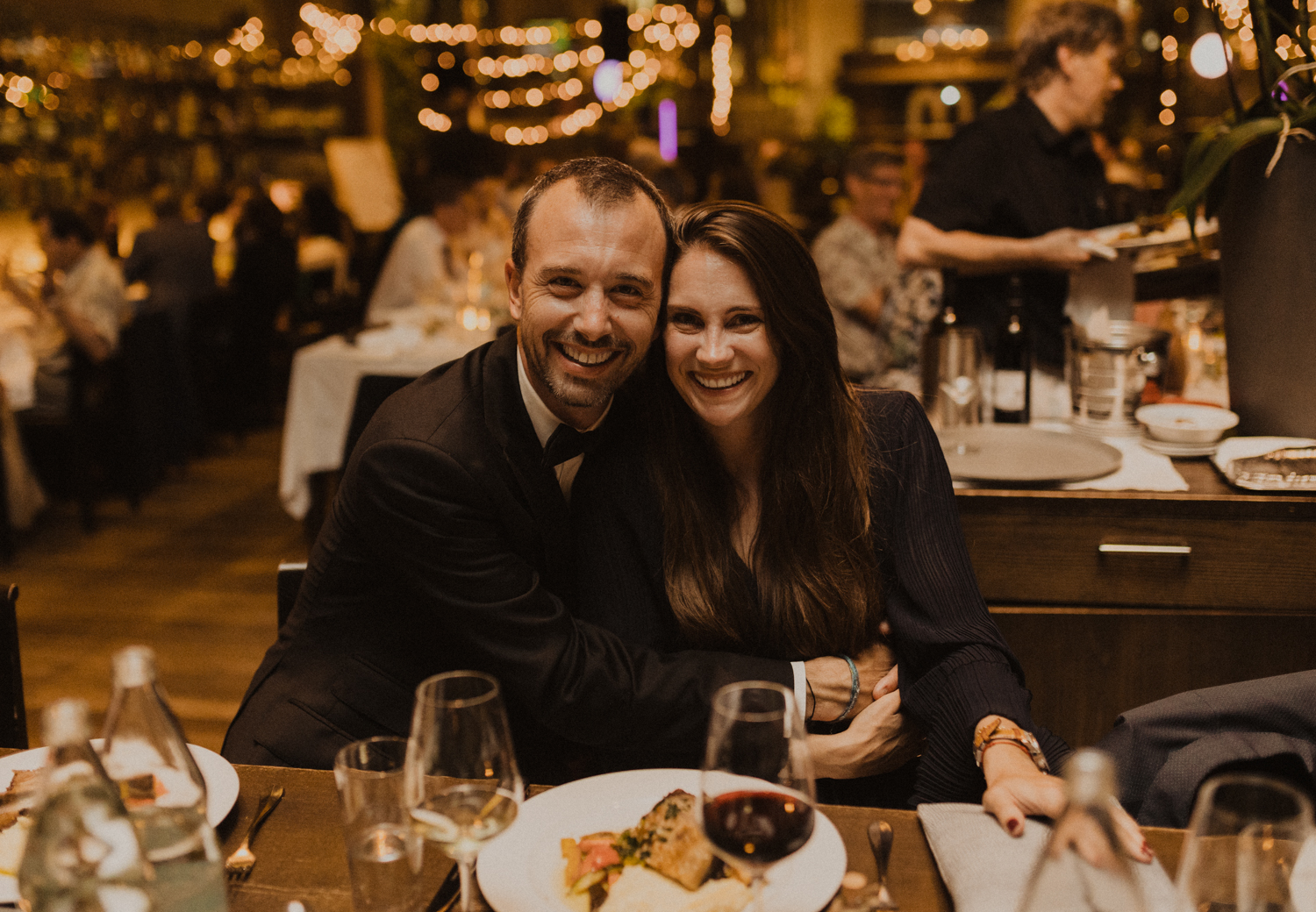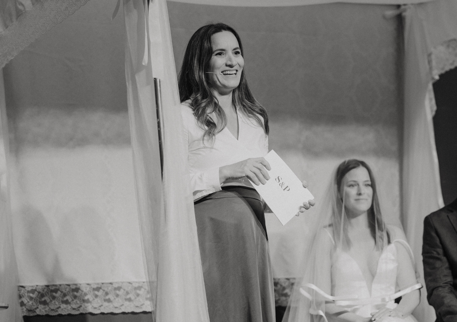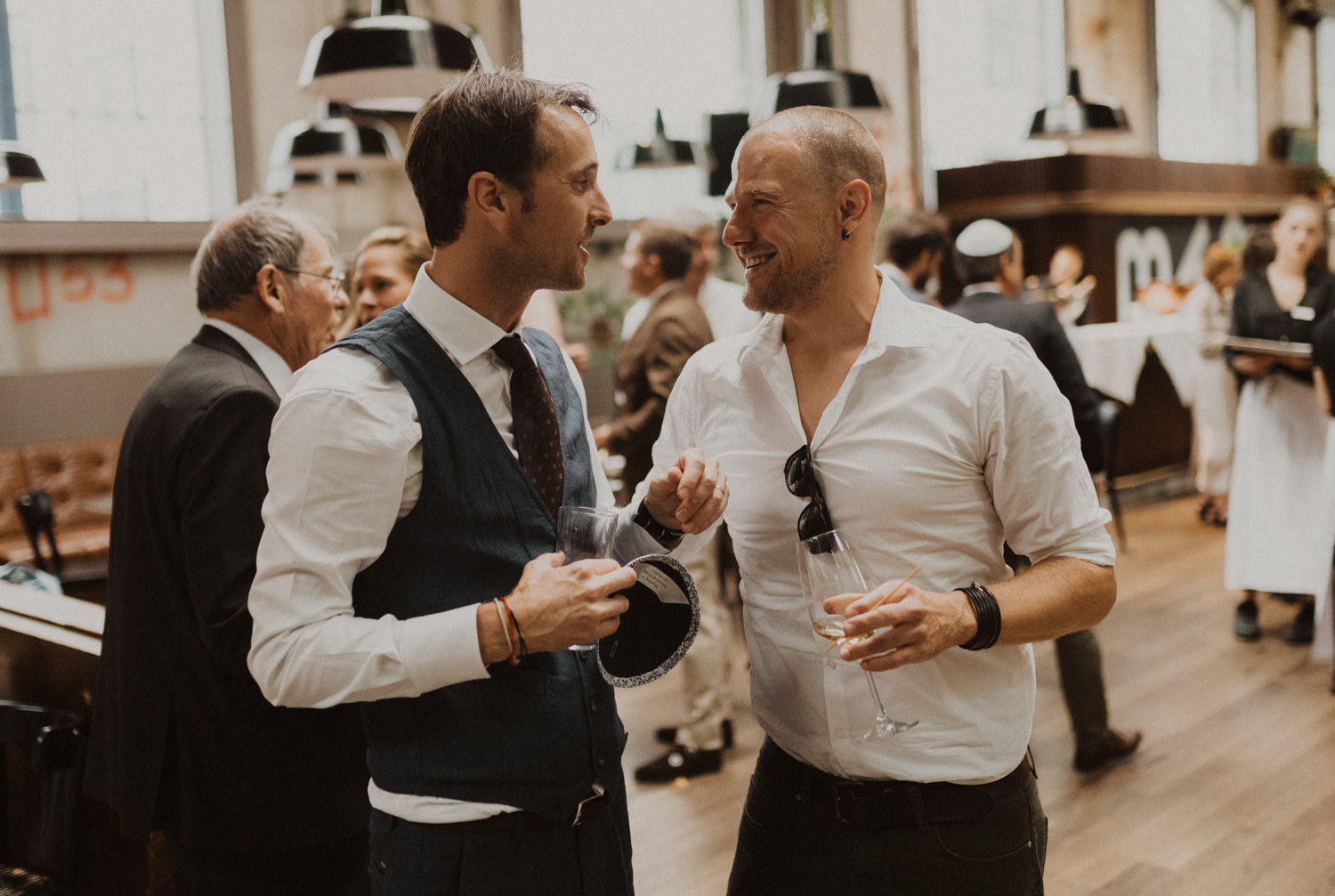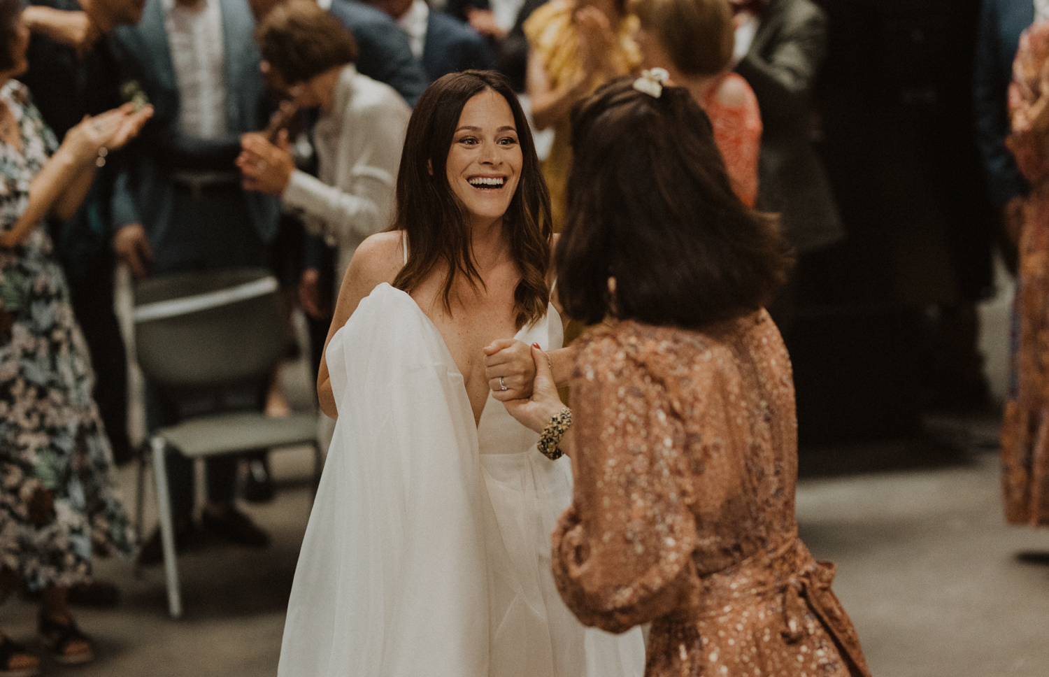 Die Gäste wurden vor der Zeremonie herzlich willkommen geheissen zu einem kleinen Apero. Danach nahmen alle Platz im super stylischen Innenraum des Schiffbau. Es wurde von einem begabten Künstler jüdische Lieder auf hebräisch gesungen, und alle welche die Lieder kannten, klatschen fröhlich mit. Ich war ehrlich gesagt super überrascht wie schön diese Sprache klingt! Der Bräutigam stand vorne bereit um seine Braut in Empfang zu nehmen. Simone hatte bei ihrem Einzug und auch noch anschliessend den Schleier traditionell noch vor dem Gesicht. Die beiden sassen auch, wie das so üblich ist bei jüdischen Trauungen, unter einer Chuppa. Nach dem Eheversprechen, der Ringübergabe, dem obligatorischen Kuss und den Segnungen durfte Philipp noch ein Glas zertreten. Auch das ist Tradition und war neu für mich. Anschliessend wurde so richtig zu jüdischer Musik getanzt und gefeiert. Es war eine super fröhliche Stimmung und hat mich sehr berührt! Danach gab es ein leckeres Apero und es wurde rege geplaudert und gratuliert. Nach diesem Zusammensein ging es in den wunderschönen Festsaal im Schiffbau. Ins Restaurant LaSalle. Die Dekoration war wirklich einmalig schön, das Essen super lecker und die Bedienung sehr freundlich. Es fanden Beiträge statt, einige Reden und Erinnerungs-Powerpoints gab es natürlich auch. Es wurde gelacht und die Liebe von Simone & Philipp gefeiert. Anschliessend kam eine richtig coole Live-Band «Maxin», welche die heutigen Hits Live spielt. Die Stimmung war super und Simone & Philipp liessen es sich nicht nehmen, zu ihrem Lieblingssong mitzusingen.