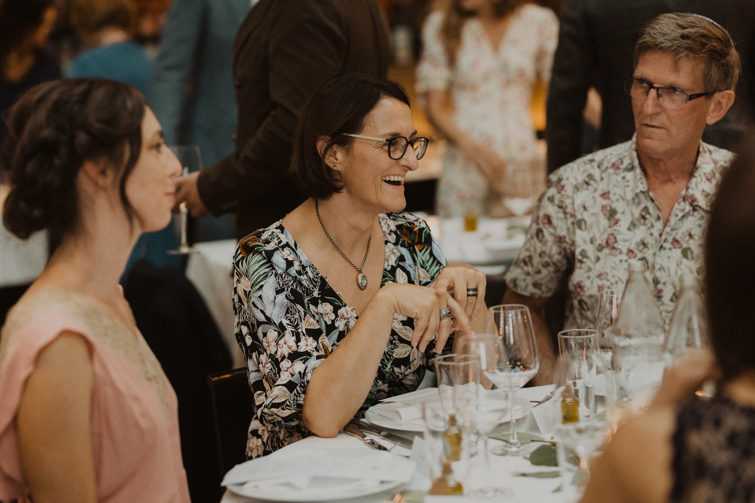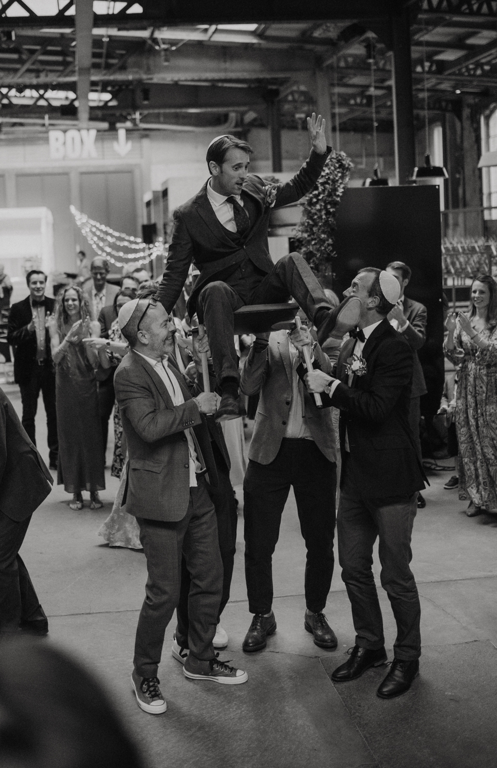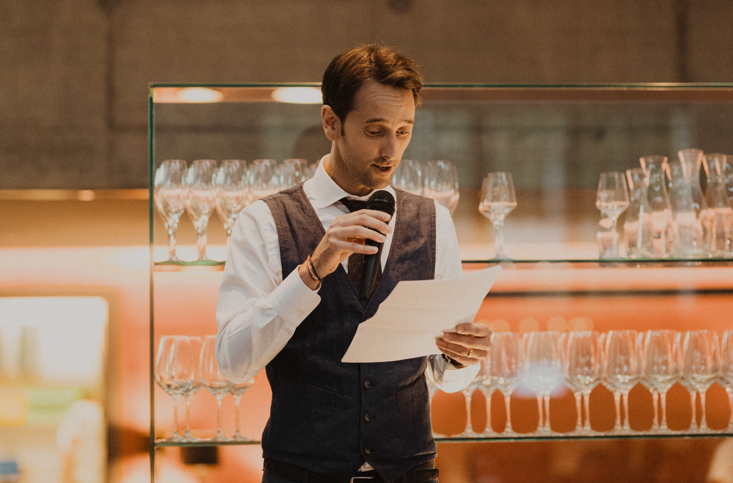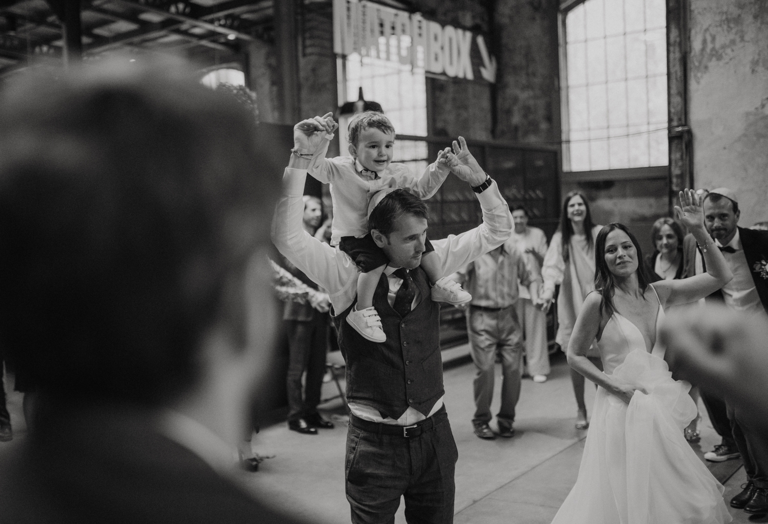 Die Gäste wurden vor der Zeremonie herzlich willkommen geheissen zu einem kleinen Apero. Danach nahmen alle Platz im super stylischen Innenraum des Schiffbau. Es wurde von einem begabten Künstler jüdische Lieder auf hebräisch gesungen, und alle welche die Lieder kannten, klatschen fröhlich mit. Ich war ehrlich gesagt super überrascht wie schön diese Sprache klingt! Der Bräutigam stand vorne bereit um seine Braut in Empfang zu nehmen. Simone hatte bei ihrem Einzug und auch noch anschliessend den Schleier traditionell noch vor dem Gesicht. Die beiden sassen auch, wie das so üblich ist bei jüdischen Trauungen, unter einer Chuppa. Nach dem Eheversprechen, der Ringübergabe, dem obligatorischen Kuss und den Segnungen durfte Philipp noch ein Glas zertreten. Auch das ist Tradition und war neu für mich. Anschliessend wurde so richtig zu jüdischer Musik getanzt und gefeiert. Es war eine super fröhliche Stimmung und hat mich sehr berührt! Danach gab es ein leckeres Apero und es wurde rege geplaudert und gratuliert. Nach diesem Zusammensein ging es in den wunderschönen Festsaal im Schiffbau. Ins Restaurant LaSalle. Die Dekoration war wirklich einmalig schön, das Essen super lecker und die Bedienung sehr freundlich. Es fanden Beiträge statt, einige Reden und Erinnerungs-Powerpoints gab es natürlich auch. Es wurde gelacht und die Liebe von Simone & Philipp gefeiert. Anschliessend kam eine richtig coole Live-Band «Maxin», welche die heutigen Hits Live spielt. Die Stimmung war super und Simone & Philipp liessen es sich nicht nehmen, zu ihrem Lieblingssong mitzusingen.
