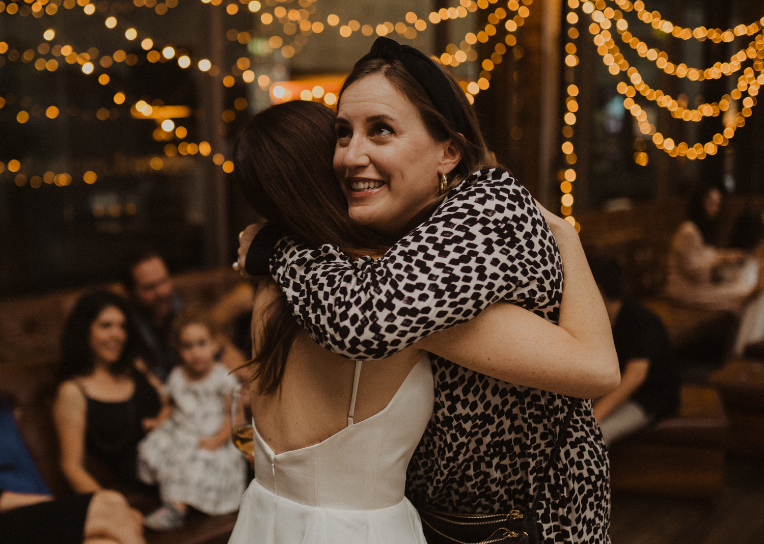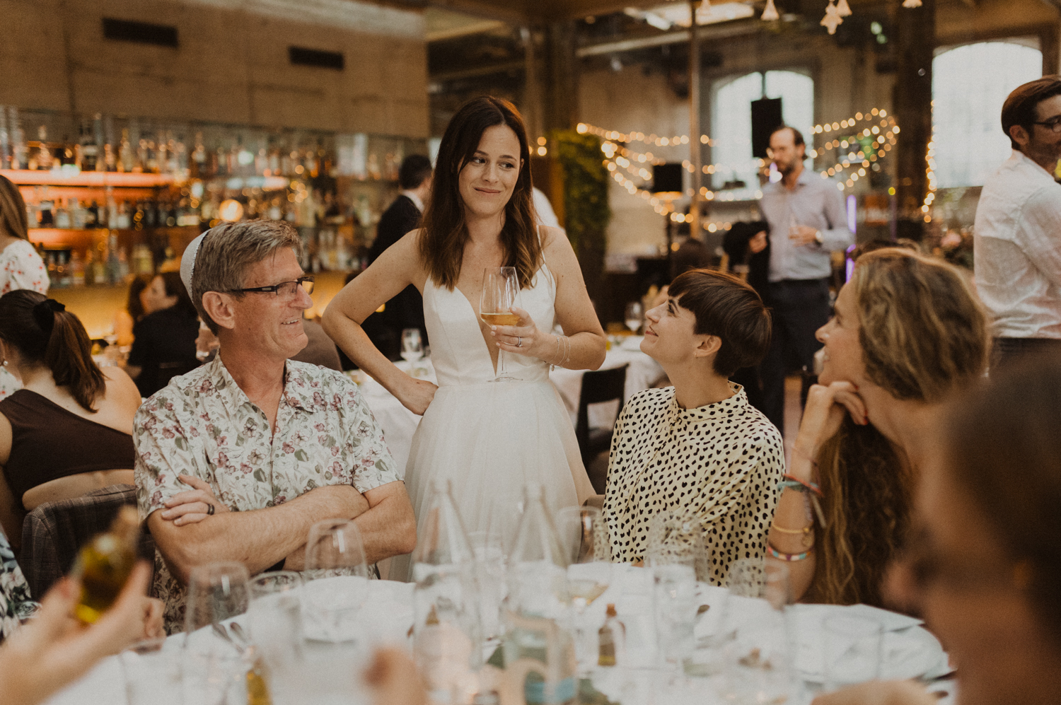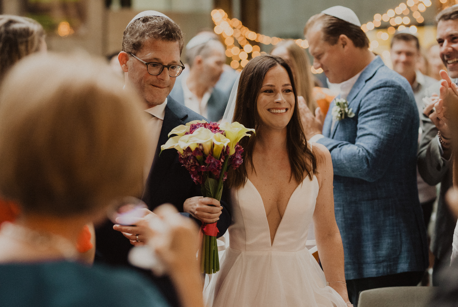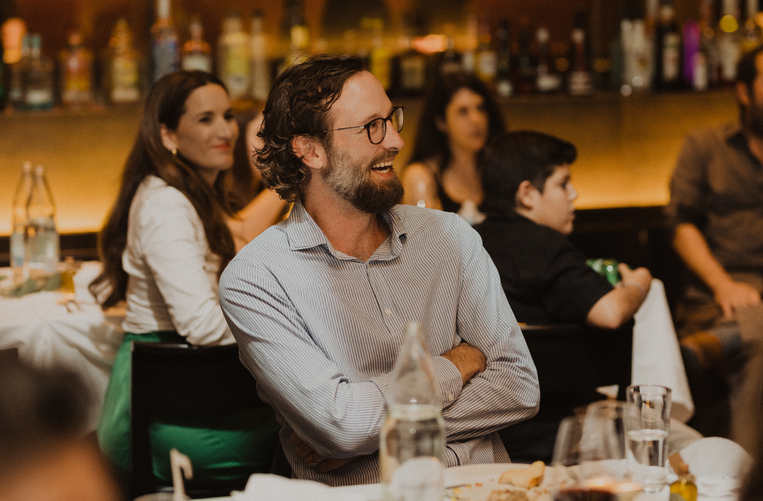 Die Gäste wurden vor der Zeremonie herzlich willkommen geheissen zu einem kleinen Apero. Danach nahmen alle Platz im super stylischen Innenraum des Schiffbau. Es wurde von einem begabten Künstler jüdische Lieder auf hebräisch gesungen, und alle welche die Lieder kannten, klatschen fröhlich mit. Ich war ehrlich gesagt super überrascht wie schön diese Sprache klingt! Der Bräutigam stand vorne bereit um seine Braut in Empfang zu nehmen. Simone hatte bei ihrem Einzug und auch noch anschliessend den Schleier traditionell noch vor dem Gesicht. Die beiden sassen auch, wie das so üblich ist bei jüdischen Trauungen, unter einer Chuppa. Nach dem Eheversprechen, der Ringübergabe, dem obligatorischen Kuss und den Segnungen durfte Philipp noch ein Glas zertreten. Auch das ist Tradition und war neu für mich. Anschliessend wurde so richtig zu jüdischer Musik getanzt und gefeiert. Es war eine super fröhliche Stimmung und hat mich sehr berührt! Danach gab es ein leckeres Apero und es wurde rege geplaudert und gratuliert. Nach diesem Zusammensein ging es in den wunderschönen Festsaal im Schiffbau. Ins Restaurant LaSalle. Die Dekoration war wirklich einmalig schön, das Essen super lecker und die Bedienung sehr freundlich. Es fanden Beiträge statt, einige Reden und Erinnerungs-Powerpoints gab es natürlich auch. Es wurde gelacht und die Liebe von Simone & Philipp gefeiert. Anschliessend kam eine richtig coole Live-Band «Maxin», welche die heutigen Hits Live spielt. Die Stimmung war super und Simone & Philipp liessen es sich nicht nehmen, zu ihrem Lieblingssong mitzusingen.